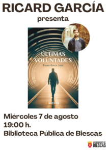 La Biblioteca Municipal de Biescas acogerá el próximo 7 de agosto la presentación de ‘Últimas Voluntades’, una actividad que contará con la presencia de su autor, Ricard García.